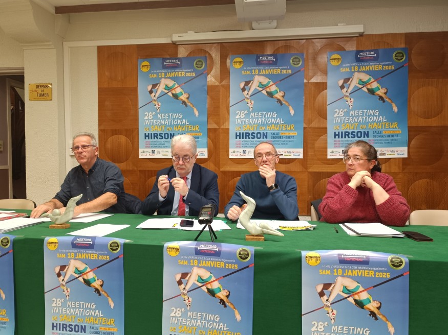 Nous nous retrouvons aujourd'hui pour la première conférence de presse de l'année 2025. Le samedi 18 janvier prochain se tiendra à Hirson le 28ᵉ Meeting de Saut en Hauteur d’Hirson, qui aura lieu au gymnase Georges Hébert.
